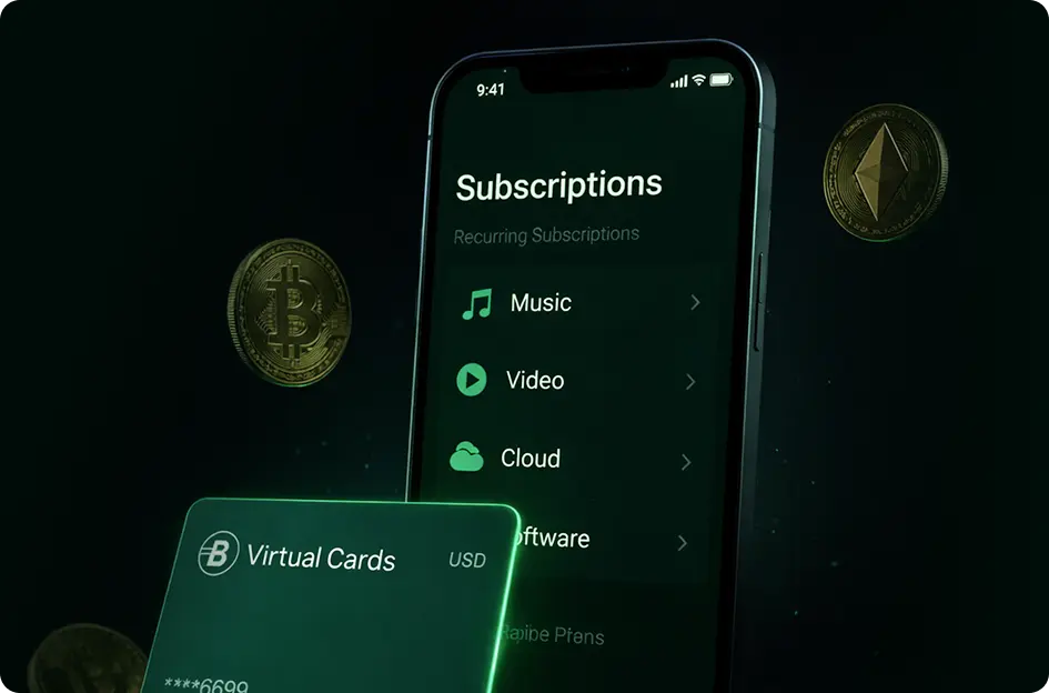 Receba seu cartão de criptomoeda virtual em minutos e comece a gastar instantaneamente sem fronteiras, sem limites em todos os seus serviços favoritos de forma segura e privada.